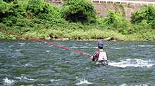 初日はミナトの瀬で竿を出す。林は瀬肩のトロ場へ入り、流芯を狙って深場へ立ち込んだ。激流の大アユ釣りを得意とする林にとっては、これがいつものスタイル。胸まで浸かってテンポ良く掛けていく。一方、チャラでの数釣りを得意とする吉田、先ずは比較的浅い場所を選んで石裏を釣っていく。しかし予想以上の型の良さに、午後からは竿と仕掛けをワンランク強くして臨む。そして徐々に深場へ。大アユの魅力にハマッていく。林はタックルはそのままに、より良い型を狙って荒瀬に移動。ガンガン流れる速い流れの中でオトリを操作して待つ。そして掛かった。体ごと持っていかれそうになるのを耐えながら抜く。25センチ。続いて吉田、24センチ。笑みがこぼれる二人。その後は入れ掛かり状態になった。二日目はナメラの瀬に入ってまた入れ掛かり。良型が面白いように乱れ飛ぶ。その爽快な様子を是非お見逃し無く。