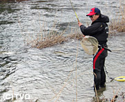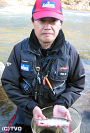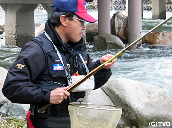 3月16日午前8時半、他の釣り師がひとしきり釣りをした後に川にやってきた。「遅くやってきても人並み以上に釣れますよ」と伊藤。流れの淀みへ振込み、立て続けに天然の美しいアマゴを4連発。 いきなりゼロ釣法の威力を発揮してみせる。この日は高水に加え、雪代が入り込み流れの中は厳しい状況、それでも流れを見極め、正確に仕掛けをポイントに流し込み釣果を伸ばしていった。翌日は雨と風。さらに状況は厳しいが、それでも天然アマゴをどんどん釣り上げる伊藤。「アタリが増えるから、ずっとワクワクしていられる。仕掛けが細いからいつもドキドキしていられる。里川で釣れるから誰でも楽しめる。ゼロ釣法はゲームですよ。」 伊藤のテクニックを参考にして欲しい。 |