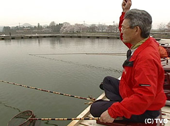 この日二人が訪れた丹生湖には多くの釣り師達がこの季節のヘラブナ釣りを楽しもうと駆けつけていた。二人はボートではなく桟橋からの実釣。しかしこの日は気温と共に水温も低く今ひとつコンディションが良くないようだ。その活性の低い状況を二人の名手は如何に打開していくかが焦点となる。岡崎は21尺の長い竿をセレクト、浜田は16尺の竿で実釣開始。午前中時間が経つにつれて天候は雨雲があつくなってくる。 そして雨が降り出した…しかしここで慌てないのが名手と呼ばれる男達。竿先をじっくりと見つめ根気よくアタリを待つ。神経をウキに集中させるその目からヘラブナは逃れる事は出来ない…ゆっくりとヘラブナが寄せられてくる。天候も回復し春の陽射しがあたり出す。