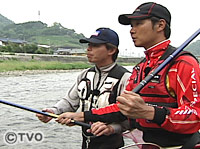 まずトロ場の泳がせ釣りしかやったことのない坂本が、浅川とペアを組み千種川と揖保川の荒瀬にチャレンジ。荒瀬ではオトリを沈めて引かなければ釣れない。場合によってはオモリも使う。糸フケを出し て、オトリを自由に泳がせるトロ場の釣りとは考え方が異なる。浅川のアドバイスを受け徐々に上達していく坂本。そして目印が走り、鮎が掛かるとそのスリリングなやり取りにビックリ。