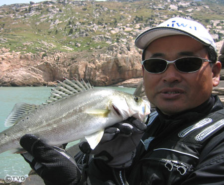帰港予定時刻の15分前、村越は磯際で待望の1尾を釣る。典型的なタイリクスズキだった。そして連発、すると今度は斑点のない日本のスズキに酷似した魚が釣れた。