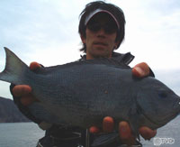 実釣スタート。この辺りの海は例年よりも1ヶ月ほど早く、まだ水温が高いという。大型の口太を狙ってハリス2号からスタートした鵜澤だったが、食いが渋く1.7号に下げる。するとズバリ読みが当ってヒット。35センチ、まずまずのサイズをゲットした。