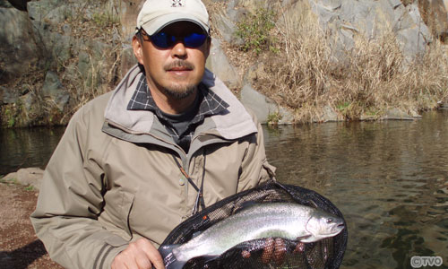 アングラーは高田達也。名作スプーンの生みの親であり管釣りの達人。高田もこの企画に興味津々。 2/13、晴天の静岡県のすそのフィッシングパークで観察を行った。3連休明けとあって、魚のプレッシャーは高い。中間色→明るい色→暗い色・・・スプーンの色を次々と変えていっても、魚は見向きもしない。やがて、アピール度の高いゴールドに変えると、ようやく魚が口を使った。が、それっきりで、あとはまったく反応しない。「リアクションバイトだった」高田は推測する。