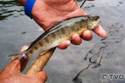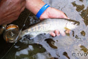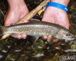 2日目の午前中は支流に入り、良型のヤマメ、イワナをテンポ良く釣っていく。
