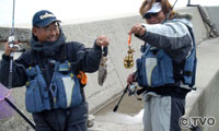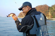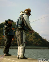 初日の午後、松山からフェリーで中島に到着した2人は、とるものもとりあえず漁港に向かい竿を出した。堤防際を覗くと、カサゴ、スズメダイ、グレ、メバル…魚がびっしり。2人は、ソフトルアーをちょんちょん躍らせ誘う。やがて村越がメバルをヒット。