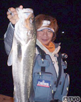 すると突然、辻原のロッドがぐにゃっとしなる。正体不明の大物が掛かった。果たして繊細なメバルタックルで上がるのか?慎重にやり取りすること約20分、ようやく上がってきたのはスズキ。しかも77cmの良型だった。これには辻原もビックリ。さらに、村越が73cmのスズキを釣り、メバルの影はすっかり薄くなった。
