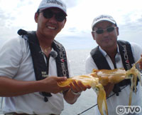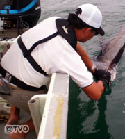 サビキ釣りでエサを確保した後、セイルフィッシュのポイントへ向かう。鳥山が魚の居場所を教えてくれる。最初はスピニングタックルで狙う村越。ネムリ針にエサを掛け投入、しばらくすると黒い影が現れエサを食う。十分加速させてからタイミングを見計らって一気にアワセを入れる。針掛りさせることはそれほど難しくない。勝負はここから。何しろラインは1号。切れるか切れないかのギリギリのやり取りが続く。やがて魚がボートに際に寄ると、ガイドのラム・チュン・ミンさんがリーダーを手繰りくちばしをキャッチ。およそ30キロのセイルフィッシュだった。