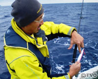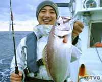 走ること約30分、ポイントに到着した。水深は100メートルほど。二人は200グラム前後のメタルジグを落とし、速めのワンピッチジャークで海底付近を丹念に探る。すると早速二人にヒット。上がってきたのは沖縄で「あかじん」と呼ばれるスジアラ、地元では高級魚だ。しばらくはあかじんが続いた二人だったが、1時間ほどしてようやく栗山が小型のヒレナガカンパチをヒット。しかしこの日は北東から吹く13メートルの風で船が流されてしまい、すぐにポイントがずれてしまい後が続かない。