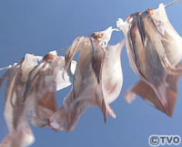 ポイントの洲崎沖に到着。船長の合図と同時にオモリを投げ入れる2人。仕掛けがタナに到着、すると北本に反応が、揚がって来たのは、スルメイカ。松永にもすぐに反応があり、巻き上げ開始。数分後、揚がって来たのは、またもやスルメイカ。その後も揚がってくるのはスルメイカのみ。途中にはサバの猛攻により、イカ釣りをさせてもらえなくなる場面も。しばらく粘りスルメイカの反応も上昇してきた。ここまではヤリイカが釣れずにスルメイカのみ。だが、スルメイカは、船上干しや沖漬けなどの釣り人にしか出来ない料理が出来るおいしいターゲットだ。