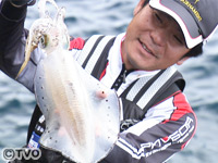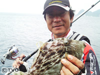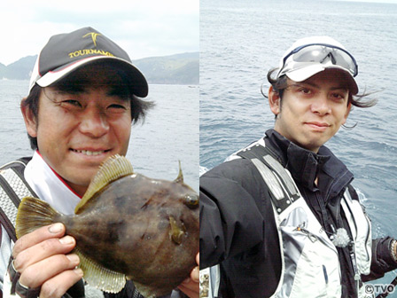 朝の釣りが一段落すると、今度はカワハギを狙うことに。竿とリールはエギングと同じものを使い、胴突き仕掛けをセット。仕掛けを投入するとすぐさまカワハギが寄ってきた。しかし、あっという間にエサを盗られてしまう。なかなか針に掛からないカワハギ。2人はどんどん熱くなる。 |