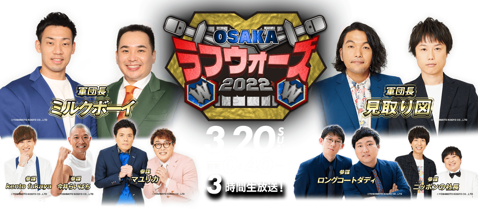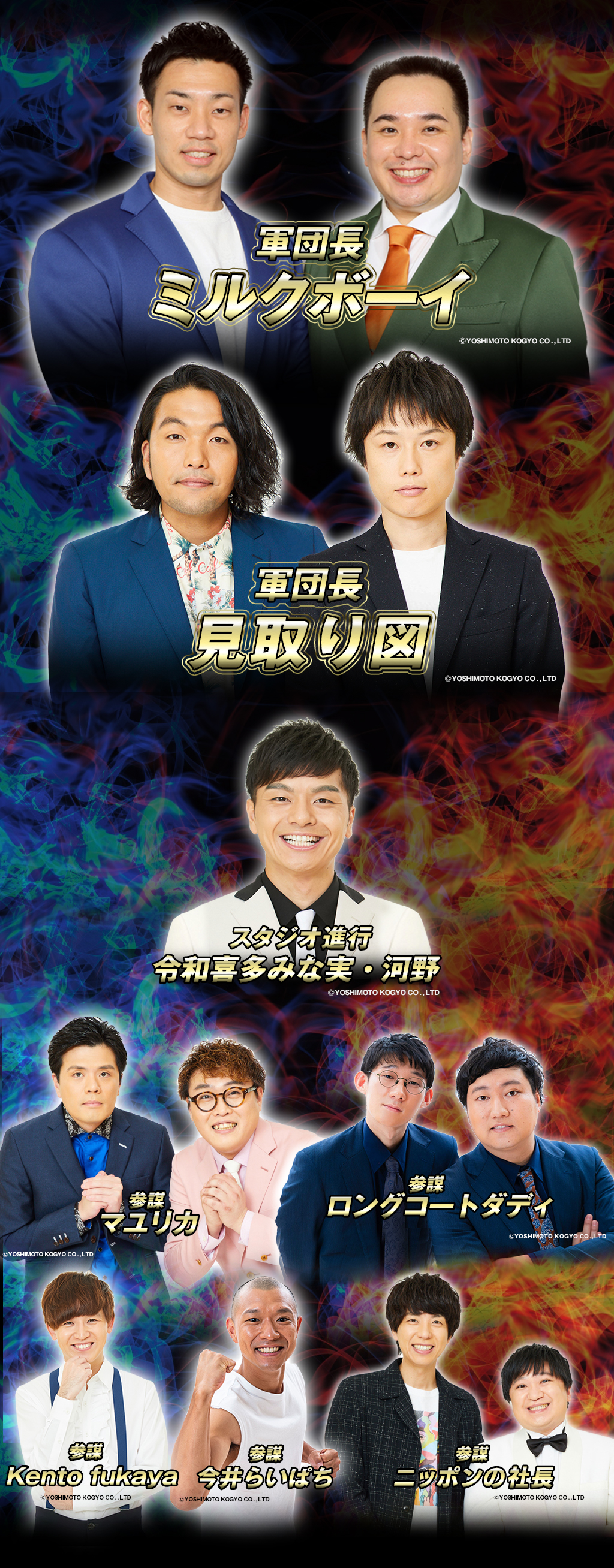 それぞれの軍団にわかれた若手バトル芸人が、 自身の最強ネタを持って敵軍とネタ対決!