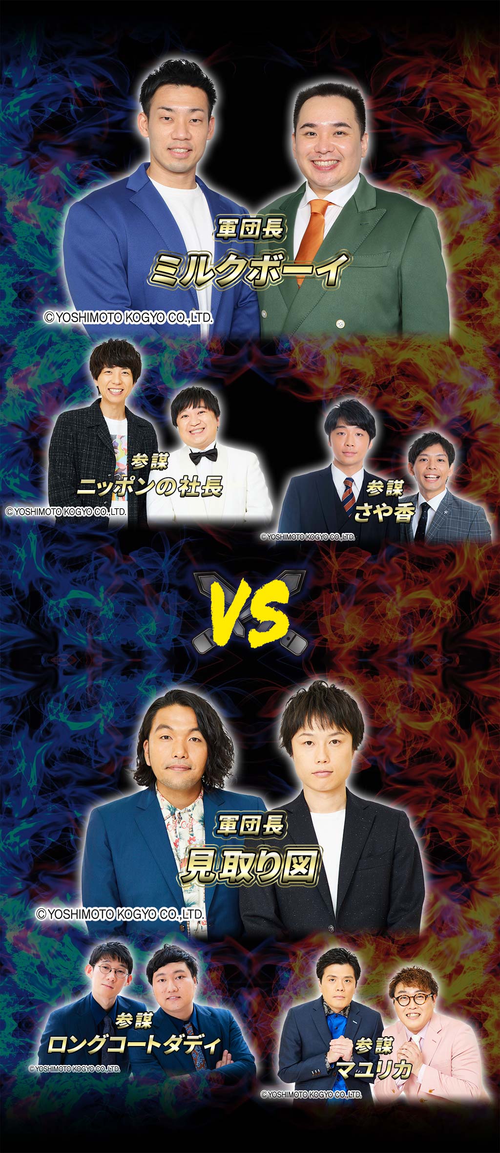 それぞれの軍団に分かれた芸人たちが、 最強のネタを武器に1vs1で対決!