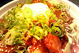 - ホルモンや牛タン、野菜などをちょっとピリ辛のタレで煮込んだ丼です。
