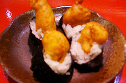 - 塩味を効かせたプリプリの海老の天ぷらを具にした一口おにぎりです。
