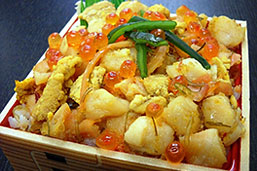 - 帆立貝、ホッキ貝などを使い、カニ、イクラを散らした具沢山のちらし寿司です!
