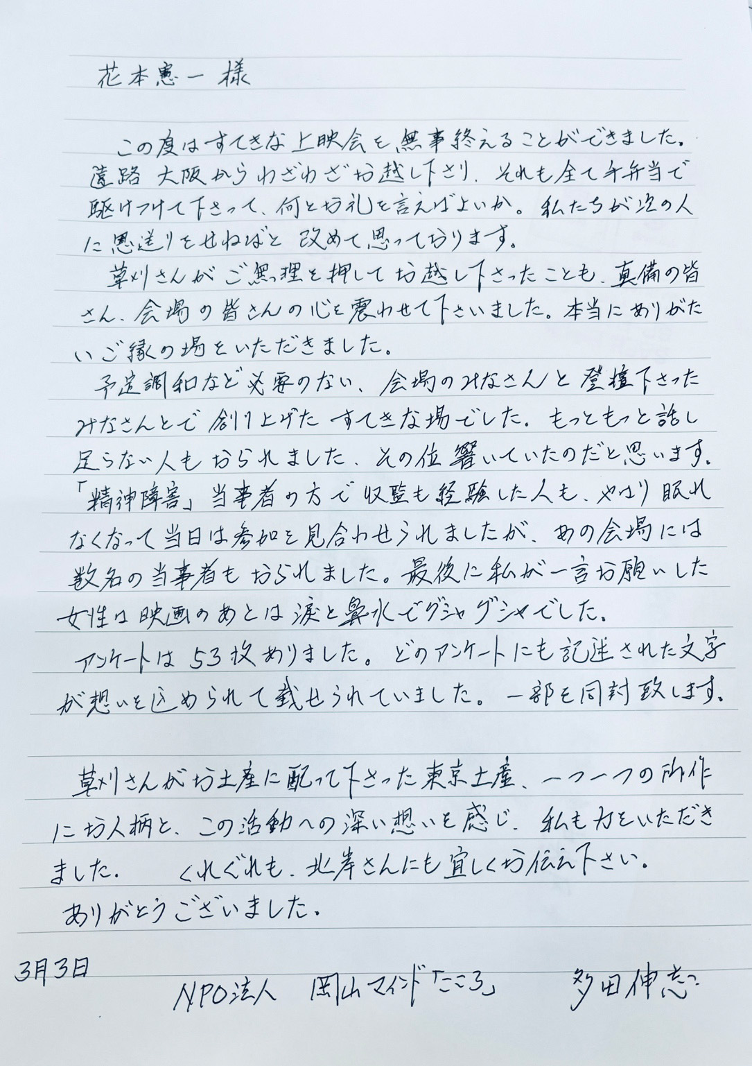 精神障害など生きづらさを抱えた人々が集い、「隠さず」まちに出る、無いものは自分たちで作るをモットーに、地域の人々の暮らしを支えているNPO法人岡山マインド「こころ」主催による上映会・シンポジウムを開催。当日、地元の福祉・医療・教育関係者など150人がつめかけました。