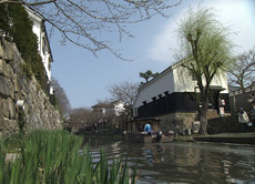 八幡堀(はちまんぼり)に並ぶ屋敷や白壁(しらかべ)の土蔵(どぞう)豪商たちの当時の繁栄ぶりを偲ばせている・・・