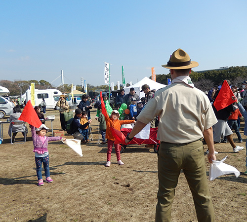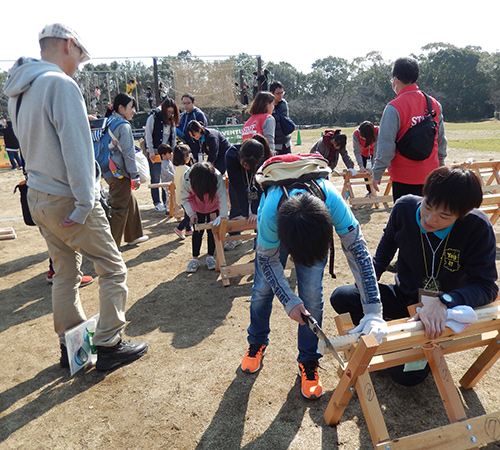 大阪府内の11の青少年団体が提供するアウトドア体験活動です。丸太切りや、木を使ったクラフト、手旗通信、簡易計測法、竹とんぼなどを体験していただきます。ノコギリの使い方、自分で切った丸太に絵を描いたり、手旗で言葉を伝える、歩測で距離を測る、竹とんぼを飛ばす、早春の野外で思いっきり遊んでください。