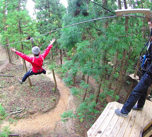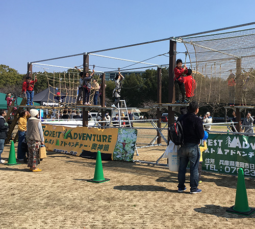 なんと☆アウトドアフェスで本格アスレチックが体験できる!5歳もしくは身長110cmのお子様から大人まで、安全ベルトを取り付けて体験できるアスレチック。奥神鍋のフィールドで体験できるアクティビティが万博で体験できるチャンス!是非、ご家族で体験にお越しください。