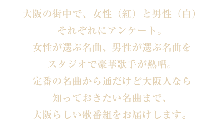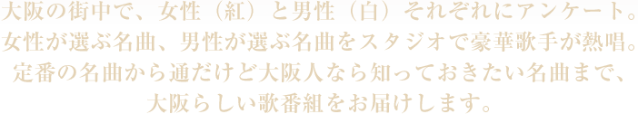女性が選ぶ名曲、男性が選ぶ名曲をスタジオで豪華歌手が熱唱。定番の名曲から通だけど大阪人なら知っておきたい名曲まで、大阪らしい歌番組をお届けします。