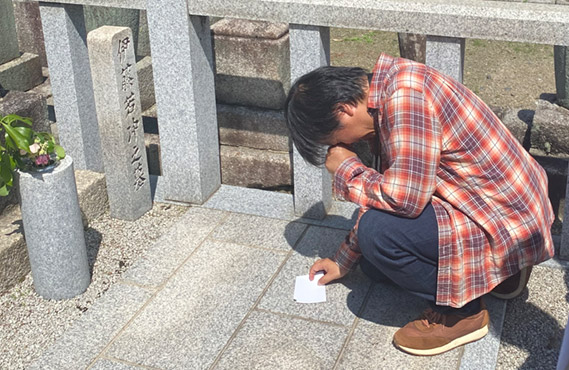 墓マイラー、カジポンさんの独特のお参り方法。墓に直接触れ、偉人に感謝を伝えるソウルトーク。「海外ではめちゃくちゃ不審者扱いされるんですよ〜」というカジポンさん。カタコト英語で理由を伝えると理解してくるそうですが、結婚して子供が生まれてからは怪しまれないように「家族同伴」で行くそうです。