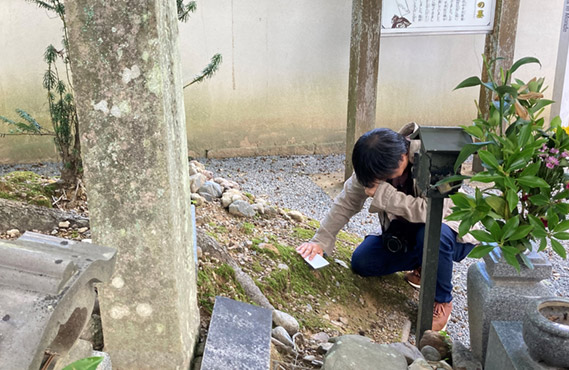 今回は天才軍師「竹中半兵衛」のお墓。 何枚かの写真を手に持っていますが、 一体何を伝えたのでしょうか?