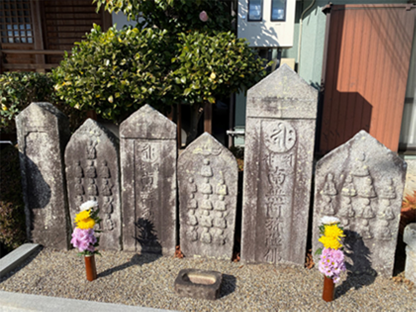 2つ板碑の隣には、慶長五年(1600)、まさに関ヶ原の戦いの直後に建てられた「十三仏板碑」も並んでいる。最初の「十三仏板碑」から26年後。村内では代替わりしていて、親の代に建てたものを自分たちもという思いで建てたのだろう。しかし、このように繰り返し建てられていた生前墓も、江戸時代に入るとピタリと終わる。「いつ死ぬかもしれない」と感じていた戦国時代が終わりを告げ、庶民たちは「死」よりも今を生きること目を向けるようになったのかもしれない。