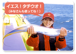 釣りが趣味というアクティブ系タレント水野裕子。今月から彼女の新コーナーがスタート。毎週、釣りと釣りにまつわる楽しいことを、元気いっぱいにお届けしている。 横須賀・新安浦港。ゆうちゃんはメーター級タチウオを見事釣り上げた。 銀箔のような輝きがきれいなこの魚の釣りは、初秋から初冬にかけ、日本各地(北海道以南)で、ビギナーからマニアまで楽しめる。 満足な釣行を終えたゆうちゃんと船長見習いの梨沙さん(22)が、ウエアからエプロンに着替えた。今回は2人が自分たちで釣った魚を料理して、食べる。メニューは刺し身、ムニエルそれに揚げ物。 タチウオは魚屋さんで売っているものはたいてい切り身。どんな顔をしているのか知らない人も多いはず。料理は塩焼きが定番。鮮度が命の刺し身を食べられるのは、釣ったその場だからこそ。皆さんも釣ってその場で食べる楽しみを味わってみください。はてさてゆうちゃんの料理のお味は? 次回のゆうちゃんは大自然の中、ルアーでトラウト(マス)を狙う。お楽しみに! ![]() |