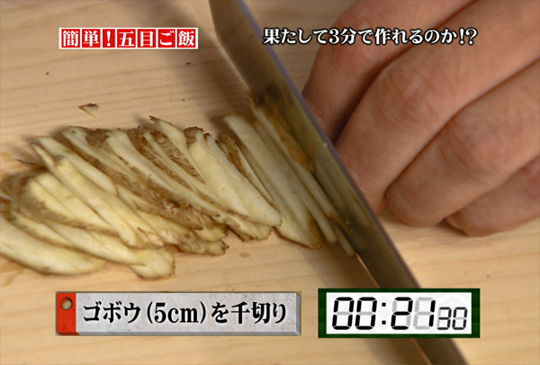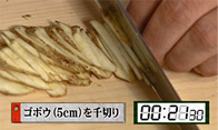 ゴボウをざっくりと千切りにし、水にさらしてアクを抜きます。