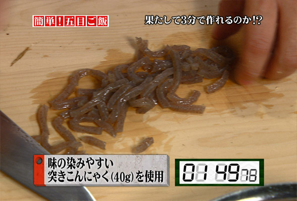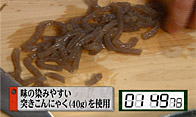 突きこんにゃくを適当な大きさに切ります。突きこんにゃくを使用することで味がしみやすく、切る手間が少なくてすみます。