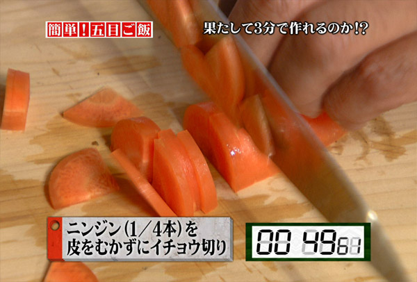 ニンジンは皮をむかずにイチョウ切りにしゴボウと同じく水に浸します。皮の部分には栄養分が多いため、あえてそのまま切ります。